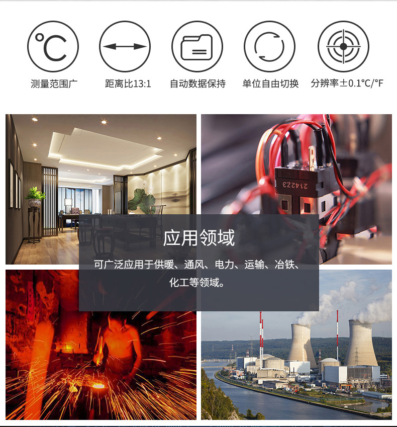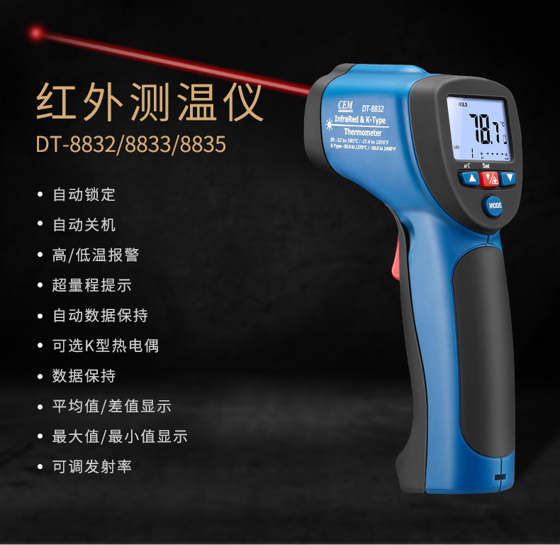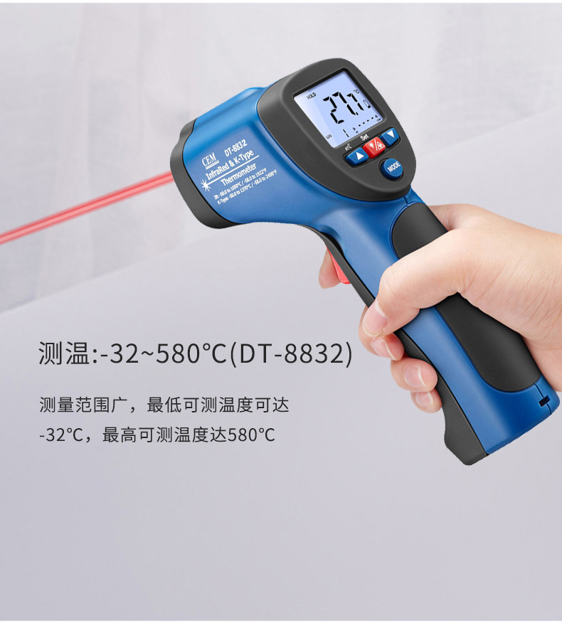 華盛昌DT-8832二合一紅外線測溫儀屬于紅外測溫儀,鋌和華盛昌CEM品牌專區(qū)提供詳細(xì)的華盛昌DT-8832二合一紅外線測溫儀介紹,包括華盛昌DT-8832二合一紅外線測溫儀價格、基本參數(shù)、產(chǎn)品特點、華盛昌DT-8832二合一紅外線測溫儀圖片、功能及適用范圍等信息,還有華盛昌DT-8832二合一紅外線測溫儀問答及用戶評價為您選購提供全方位的參考。想了解更多更全的華盛昌CEM紅外測溫儀報價、型號、種類以及使用方法相關(guān)內(nèi)容,可以到華盛昌CEM品牌專區(qū)。 華盛昌DT-8832二合一紅外線測溫儀是紅外測溫和K型溫度測溫結(jié)合的二合一紅外線測溫儀 雙注塑機殼、1米防摔,高達(dá)30:1的距離比 帶K型熱點偶測溫,可以根據(jù)您的需要適應(yīng)不同場合的測溫要求。 溫度段從380℃至1050℃滿足測溫場景 ℃/℉溫度單位轉(zhuǎn)換 可達(dá)±1.5%測量精度 自動數(shù)據(jù)保持 20個數(shù)據(jù)儲存 最大值/最小值顯示 K型熱電偶測溫(量程設(shè)計-50℃至1370℃) 超亮背光LCD顯示,在暗處也可以輕易測量和讀數(shù) 自動獲取目標(biāo)的可調(diào)發(fā)射率,可測量不同材質(zhì)的物體表面溫度 距離比D:S=16:1,30:1供選擇,高距離比可遠(yuǎn)距離測量更小尺寸目標(biāo)