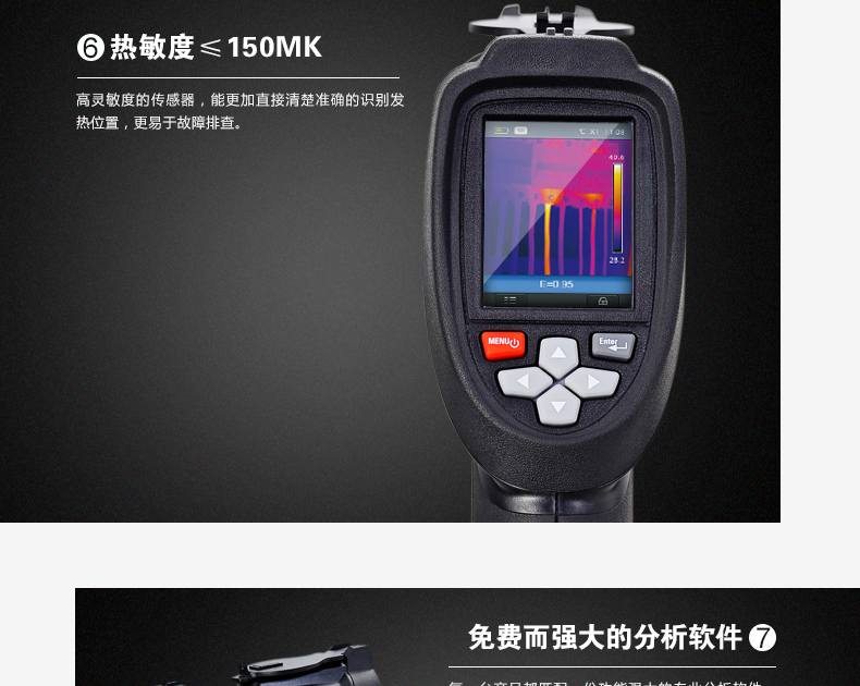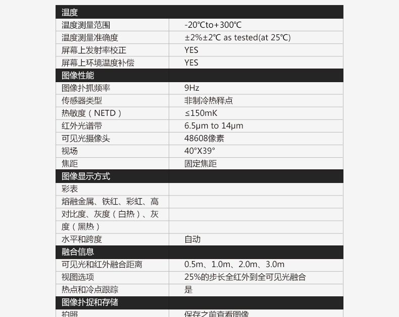 2.2寸TFT 320*240像素彩色液晶顯示屏;分辨率32*31像素;圖片捕獲頻率9Hz;熱靈敏度;自動(dòng)追蹤標(biāo)識區(qū)域內(nèi)最高溫和最低溫;拍照功能;支持MicroSD儲(chǔ)存卡和數(shù)據(jù)記錄功能;時(shí)間/日期/設(shè)置,可調(diào)輻射率和鎖屏;可充電鋰電池;支持USB接口;語言種類:英語;Meterbox IRTP 和云儲(chǔ)存
