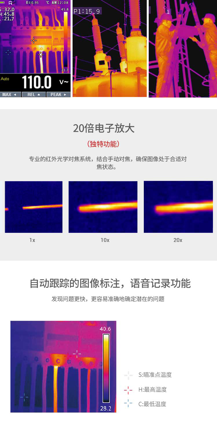 標(biāo)配鏡頭7.5mm,分辨率160×120,IFOV:3.33mard,視場角29.8×22.6°,熱靈敏度NETD<0.08℃,圖像幀頻50Hz,溫度范圍(-20-150、0-400),可見光分辨率640×480像素