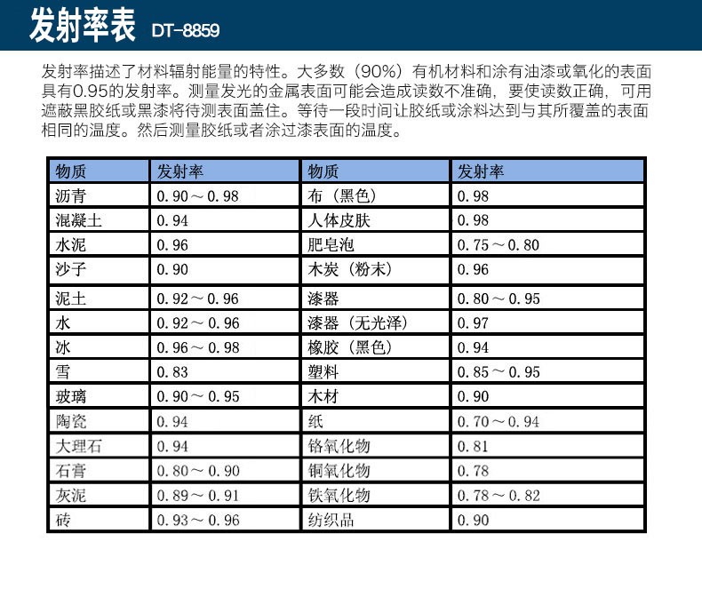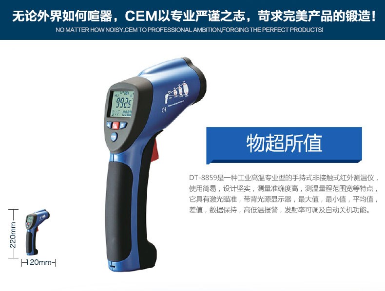 DT-8829紅外線測溫儀一種專業(yè)型的手持式非接觸紅外線測溫儀,使用簡易,設計堅實,測量準確度高,測溫量程范圍寬等特點。它具有激光瞄準,帶背光源顯示器,最大值,最小值,平均值,差值,數(shù)據(jù)保持,高低溫報警,發(fā)射率可調(diào)及自動關機功能。該手持式非接觸紅外線測溫儀可用于測量那些不適合使用傳統(tǒng)接觸式測量方法來測量物體的表面溫度(例如移動物體,帶電表面和難以接觸到的物體)。特征:非接觸式精確測溫高的光學測量距離與物體目標比(D:S-16;1/50:1)測溫量程范圍寬獨特新式的機殼設計內(nèi)置激光瞄準器自動數(shù)值保持℃/F轉換按鍵發(fā)射率調(diào)整從0.10 到1.0,(8829固定在0.95)MAX,MIN,DIF,AVG 溫度顯示帶背光源LCD顯示屏自動選擇量程,分辨率為0.1