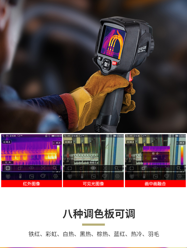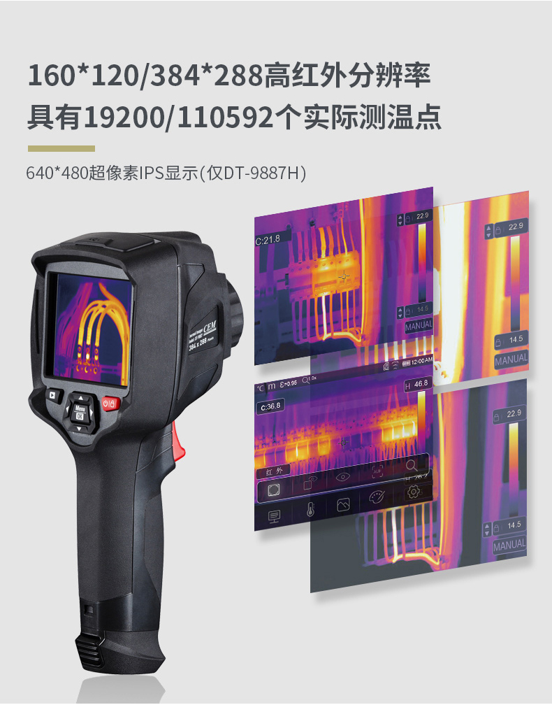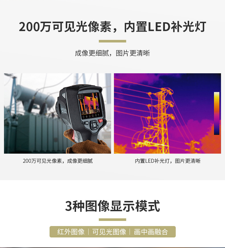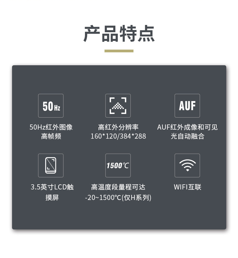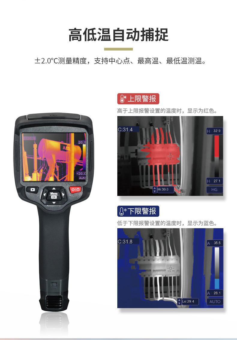標(biāo)配鏡頭22mm,分辨率324×288,IFOV:1.14mard,視場(chǎng)角24.5×18.6°,熱靈敏度NETD<0.06℃,圖像幀頻50Hz,溫度范圍(-20-150、0-400),可見光分辨率640×480像素