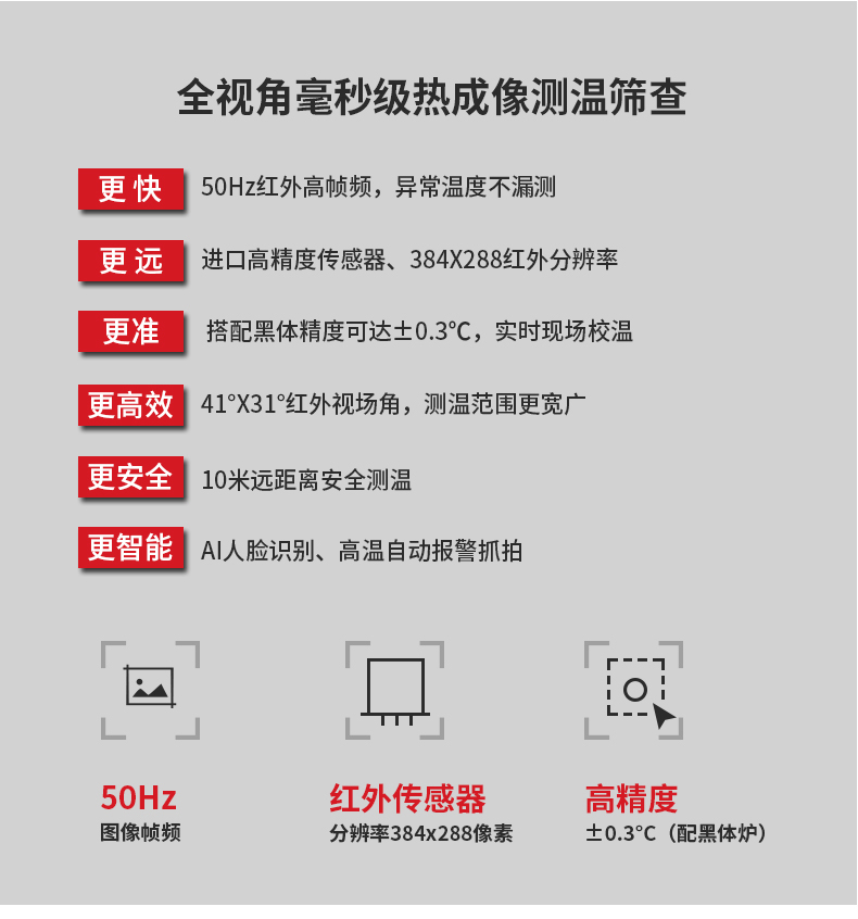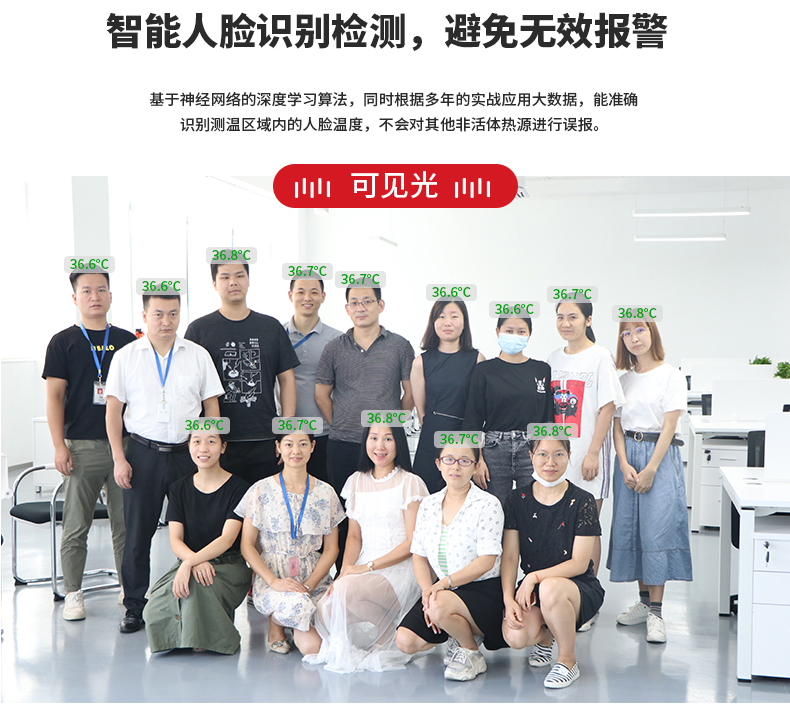 ·標(biāo)配黑體,實(shí)時(shí)溫度校正,測溫精度士0.3°℃·智能快速識別測溫,效率可達(dá)900人/分鐘·AI人臉識別,排除異常熱源干擾,誤報(bào)率更低20年非接觸紅外測溫研發(fā)經(jīng)驗(yàn),測溫更優(yōu)更準(zhǔn)確