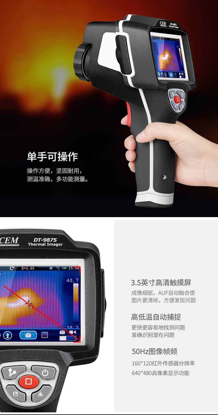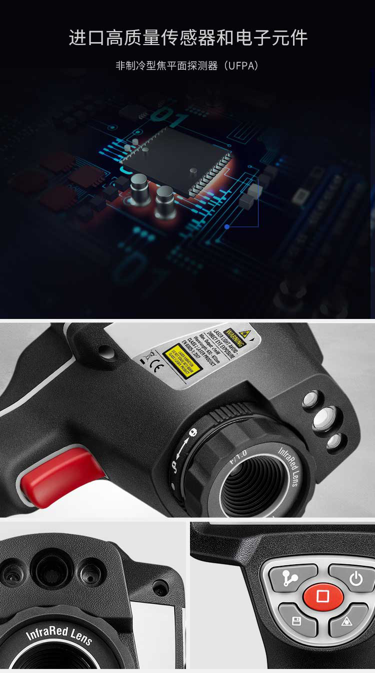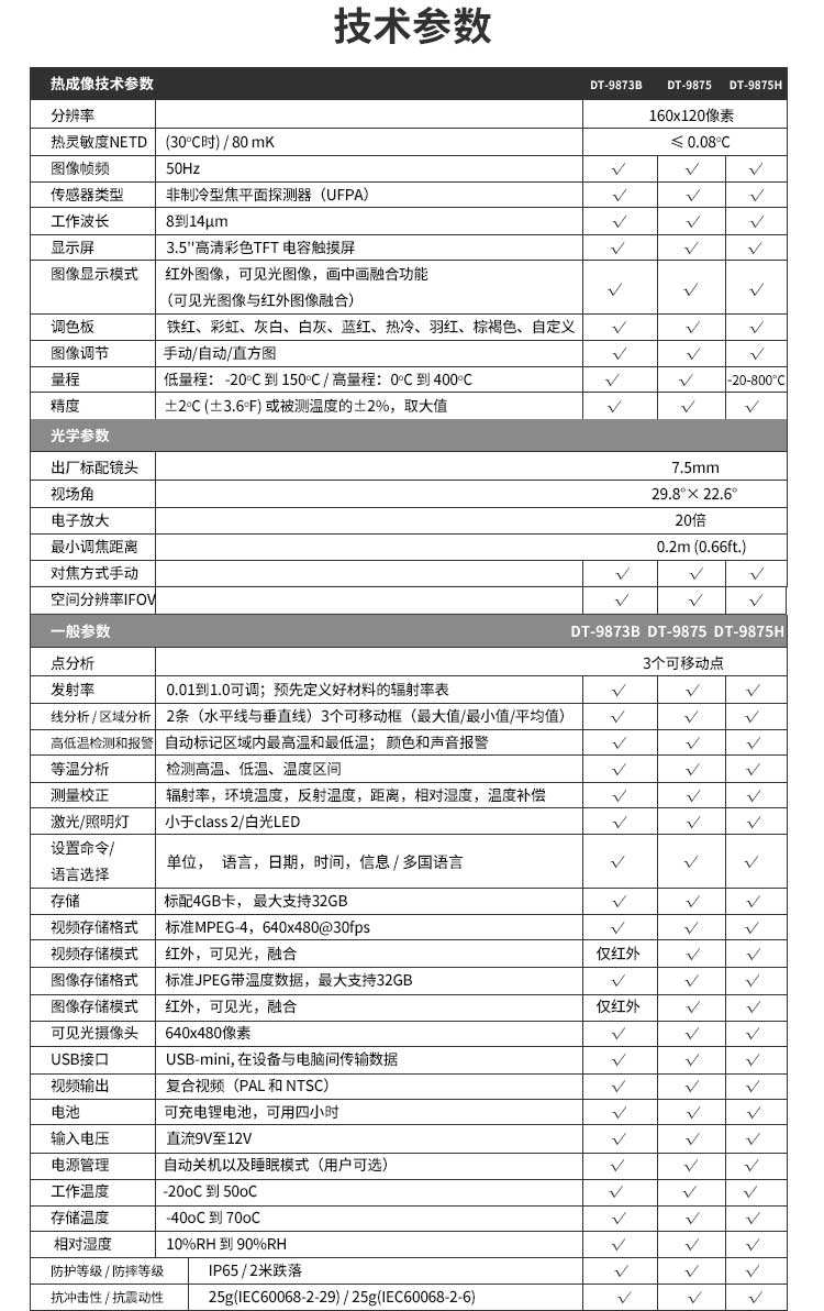 標配鏡頭7.5mm,分辨率160×120,IFOV:3.33mard,視場角29.8×22.6°,熱靈敏度NETD<0.08℃,圖像幀頻50Hz,溫度范圍(-20-800),可見光分辨率640×480像素