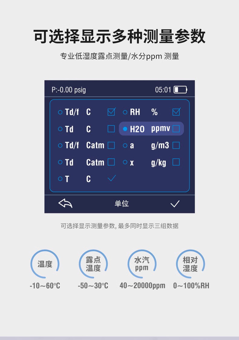 高品質(zhì)傳感器,測量更準(zhǔn)確,適用于低露點(diǎn)測量。測量范圍達(dá)-50至+30°C,低濕度測量<5%RH?!駛鞲衅骺沙惺苣Y(jié),無需擔(dān)心結(jié)露影響測量精度。